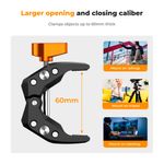 El diámetro máximo de la mordaza de súper abrazadera es de 60 mm, lo que puede fijar fácilmente objetos de varios tamaños, como barandillas, tableros de mesa, soportes de iluminación, ramas, etc.