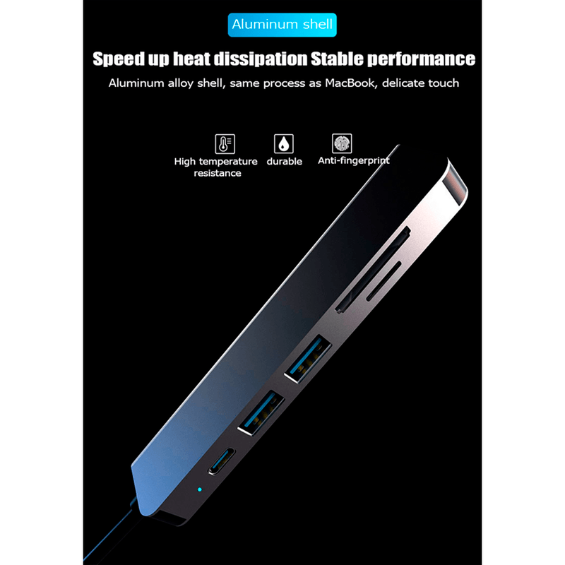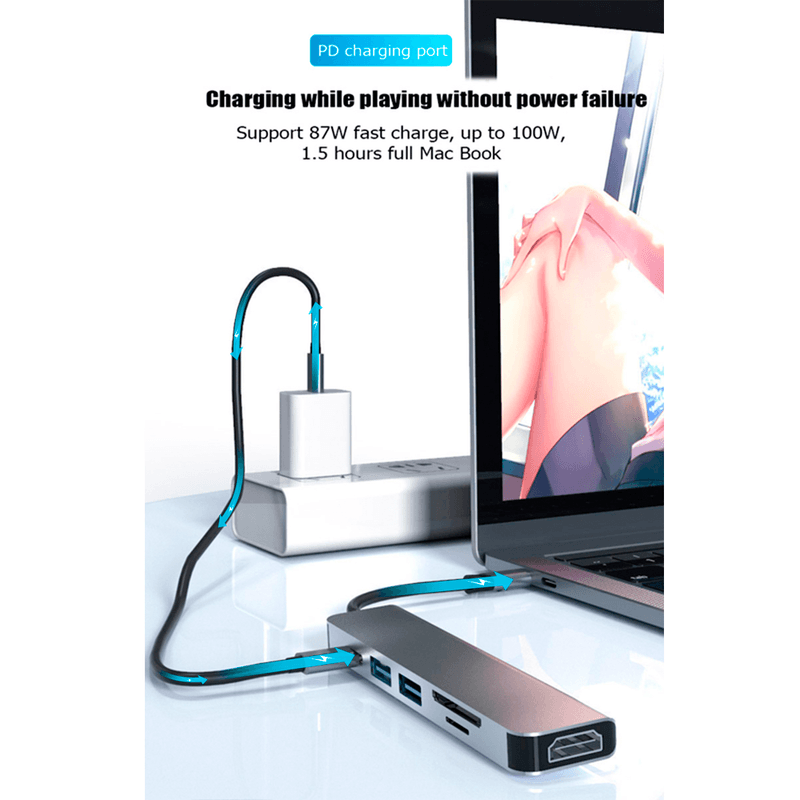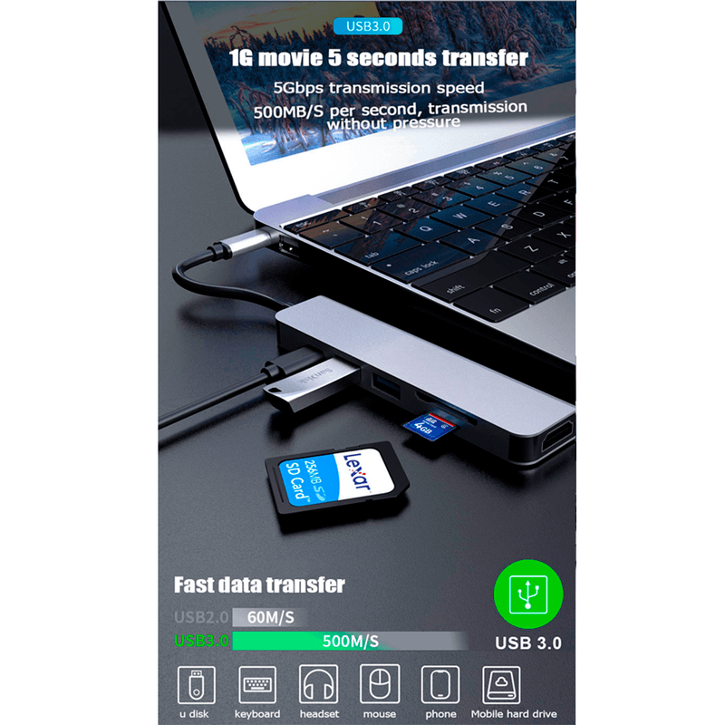 *Adaptador multipuerto que permite conectar a tu computadora o celular Tipo C a 1 monitor HDMI, 2 puertos USB 3.0 para teclado, mouse, impresora, disco duro entre otros, 1 puerto tipo C de carga Power delivery hasta 100W, 1 Puerto TF , 1 Puerto MicroSD. Para laptops que no tienen el puerto HDMI, y celulares con MHL.