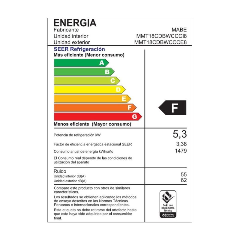 ElectrohogarClimatizaciónAires Acondicionados SplitAire Acondicionado Mini Split Mabe MMT18CDBWCCCE8 R410A 18000 BTU/h Blanco