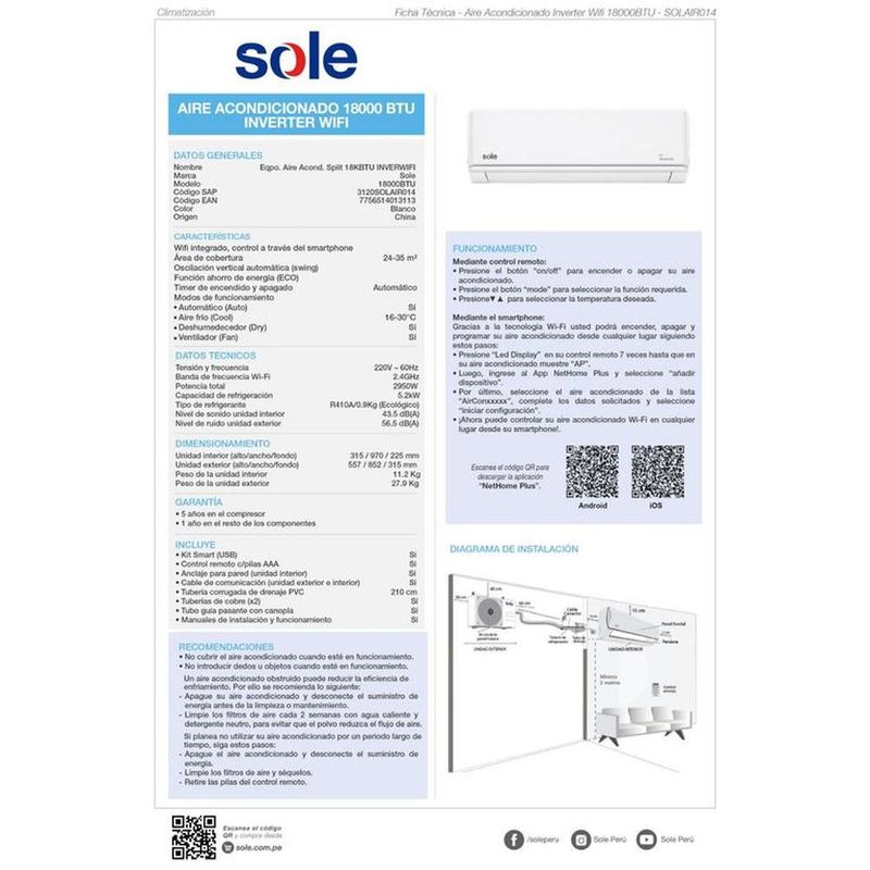 Aire Acondicionado Sole Split Inverter Wifi 18 Kbtu