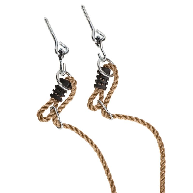 Trapecio de madera con anillas para el uso en exterior. Tiene un sistema de anclaje con ganchos metálicos.