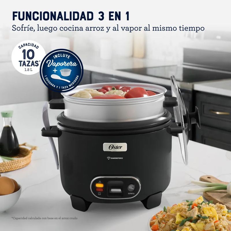La arrocera Oster® CKSTRC10DFBLK-053 con recubrimiento DiamondForce™ es ideal para quienes buscan practicidad, durabilidad y resultados perfectos en cada comida. Con capacidad para 10 tazas de arroz cocido, es ideal para familias pequeñas o medianas. El exclusivo recubrimiento antiadherente DiamondForce™, reforzado con partículas de diamante, ofrece 4 veces más durabilidad que los recubrimientos tradicionales, evita que el arroz se pegue y facilita la limpieza. Incluye una tapa de vidrio templado, canastilla para cocción al vapor, y función automática para mantener caliente. Características destacadas: Capacidad: 10 tazas de arroz cocido Tecnología DiamondForce™: antiadherente ultra resistente Función de mantener caliente automáticamente Tapa de vidrio templado con salida de vapor Incluye canastilla para vapor, taza medidora y cuchara para servir Diseño moderno en color negro Fácil de usar y limpiar