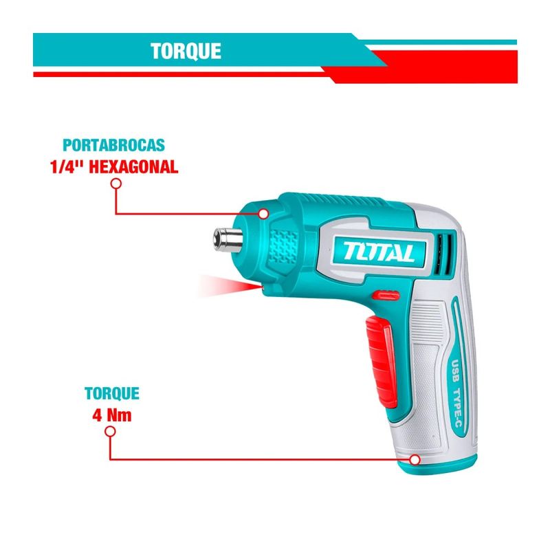 Este atornillador TOTAL TSDLI0458 es una herramienta confiable que combina potencia, tecnología y comodidad, ideal para cualquier amante del bricolaje o profesional que busque resultados impecables.