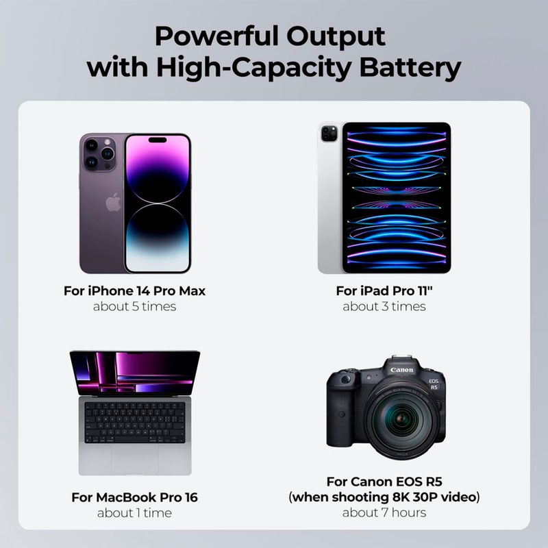 Potente capacidad de 99 Wh. La mini batería de montura V cuenta con 99 Wh, 14,8 V y 6700 mAh de alta capacidad, lo que permite una mayor duración en proyectos de producción de vídeo y fotografía.
