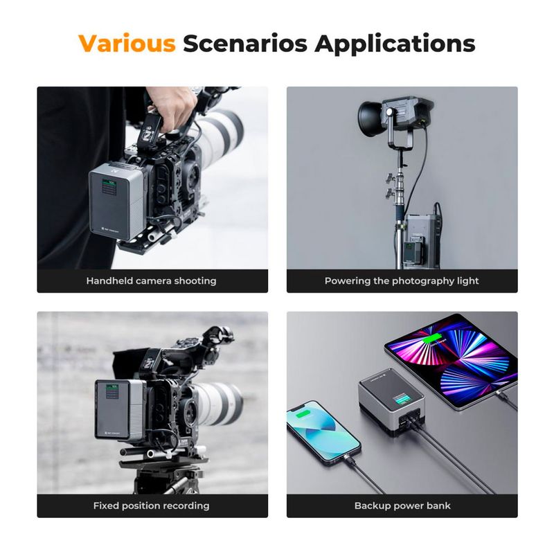 Con dos puertos USB-C, un USB-A, un puerto DC (12 V, 5,5 x 2,5 mm), BP y D-TAP, esta batería garantiza que pueda alimentar una amplia variedad de dispositivos simultáneamente, lo que la convierte en un centro de energía versátil para todos sus equipos.