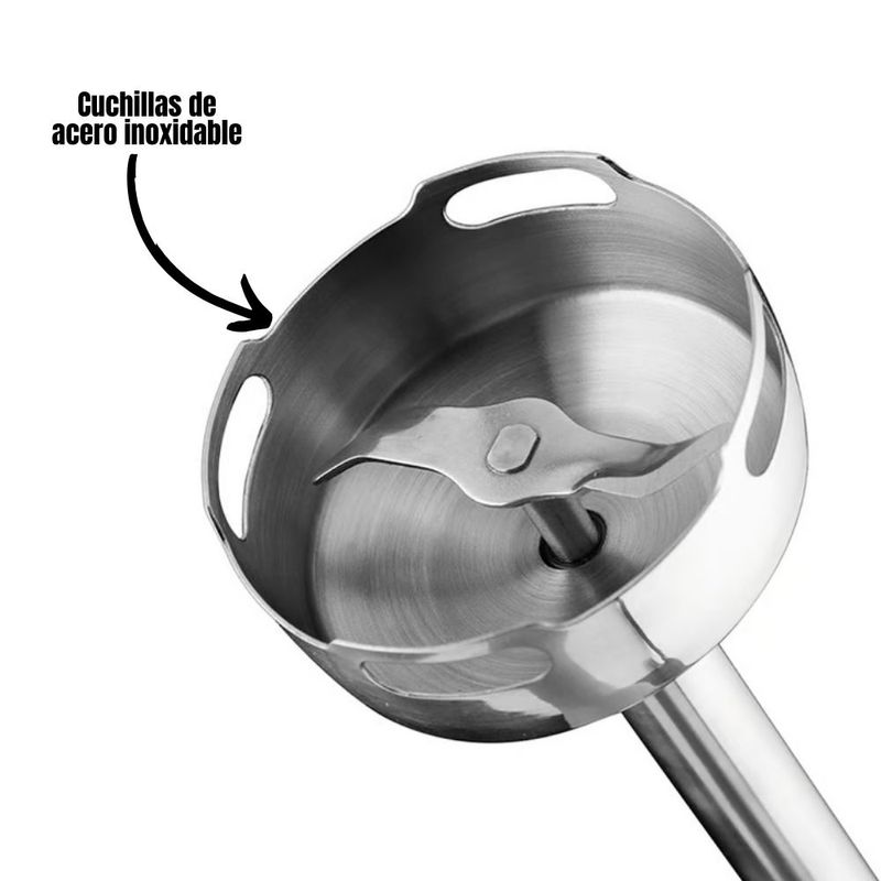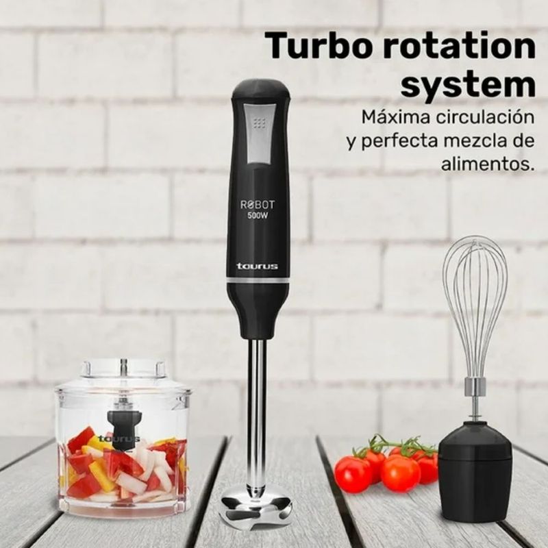 Consigue una perfecta circulación de los alimentos y calidad de las texturas con Robot 500. Gracias a su Turbo Rotation System y su sistema de anti salpicaduras. Cuenta con 3 accesorios: vaso medidor, varilla emulsionadora y picador, potente batidora de varilla con cuchillas de alto rendimiento en acero inoxidable.