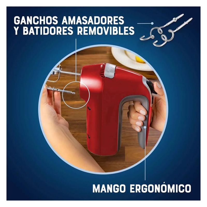 Esta práctica batidora de mano Oster® te permitirá preparar desde gruesas masas de galleta hasta delicados merengues. El diseño ergonómico de su mango, brinda comodidad para que prepares deliciosas comidas y postres con facilidad. También cuenta con 7 velocidades + función turbo y un motor potente de 320 W. El control de 7 velocidades y la función turbo provee potencia adicional y permite preparar una amplia variedad de recetas. La batidora de mano viene con un conveniente compartimiento para almacenar la batidora, el cable y todos los accesorios. - Control de 7 velocidades que permite preparar desde un delicado merengue hasta masa para galletas. - Función turbo que provee potencia adicional al toque de un botón para trabajar con masas espesas. - Mango de diseño ergonómico conveniente. - Compartimiento que se acopla a presión para almacenar la batidora de mano, el cable y todos los accesorios *Incluye batidores y ganchos amasadores.