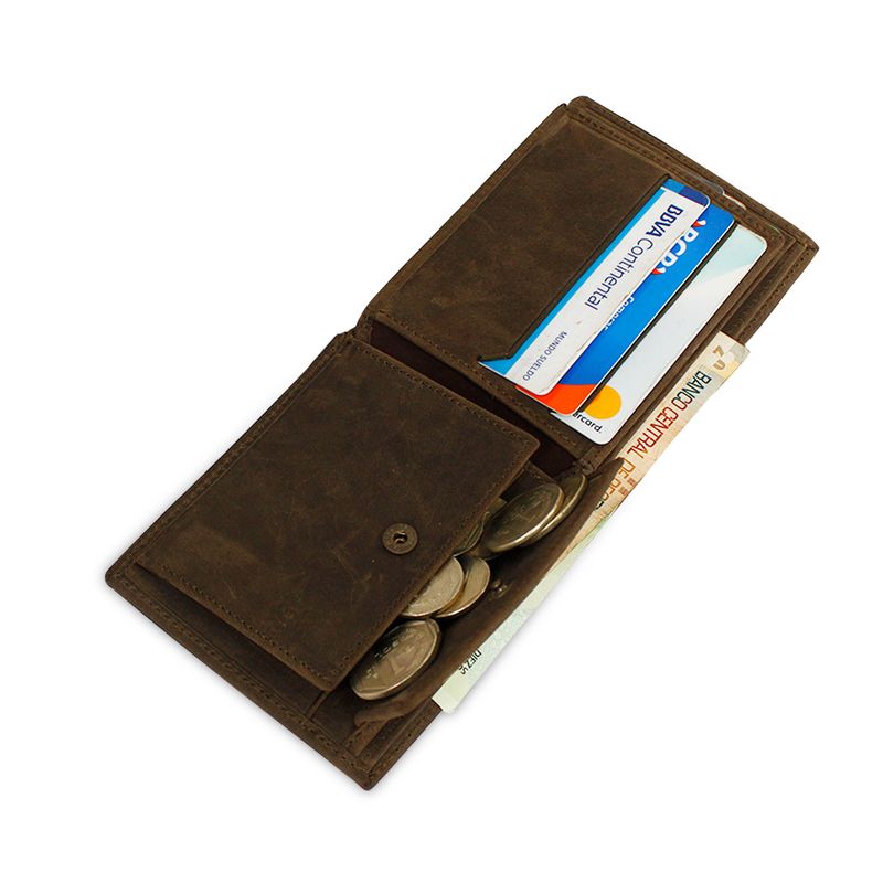 Producto fabricado con estilo juvenil y elegante, material externo 100% cuero premium, material Interno 100% Poliéster, logo de Marca en placa metálica, doble compartimento para billetes, compartimentos para monedas, compartimento para 7 tarjetas con 3 bolsillos adicionales para tarjetas o documentos y 1 portafoto.