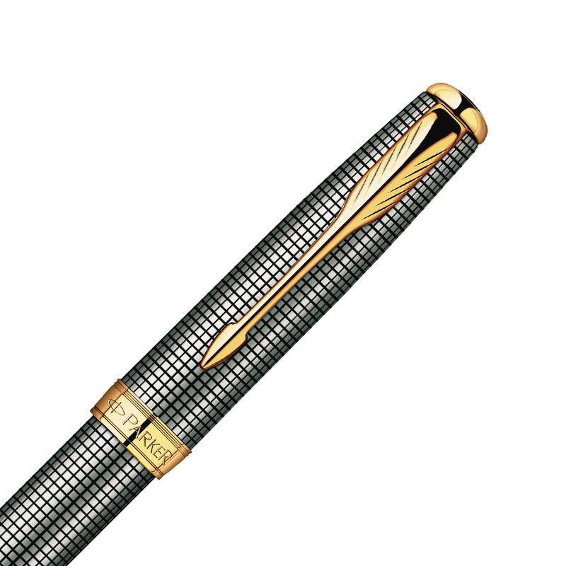Bolígrafo de la línea Sonnet de Parker de plata esterlina maciza con diseño de trama cruzada con delicadas líneas de laca negra, detalles enchapados en oro 23k. Mecanismo de giro para apertura y cierre. Presentado en una caja de regalo de Parker.
