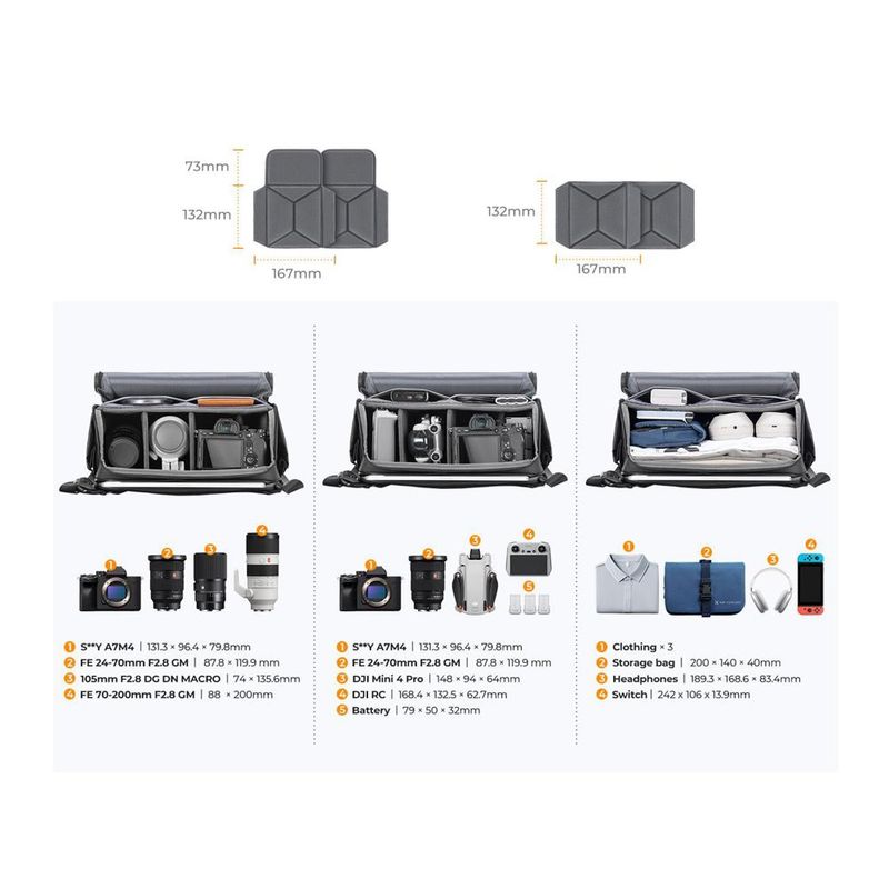 Ya sea que salgas de excursión o a una sesión fotográfica urbana, la bolsa lateral para cámara K&F Concept KF13.163 te garantiza una forma segura, organizada y elegante de llevar tu equipo.