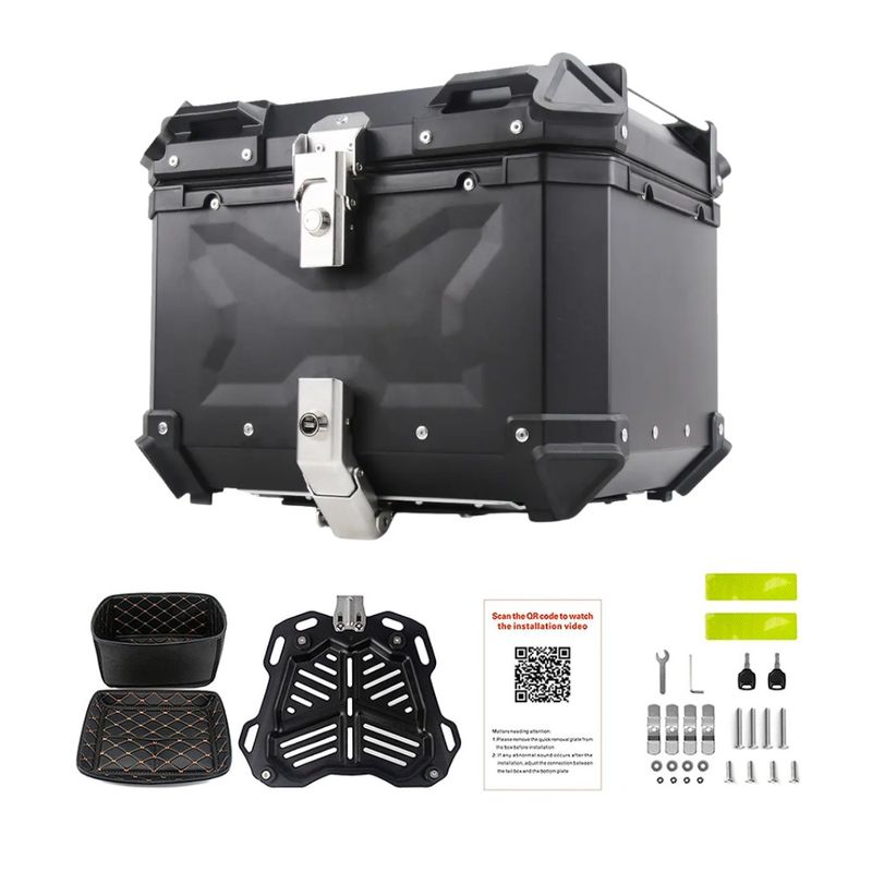 Cajuela de aluminio de 45 litros diseñada para mejorar la capacidad de carga de tu moto con estilo y durabilidad. Fabricada en aleación de aluminio de alta calidad, esta cajuela es resistente, ligera y apta para uso urbano o aventura ligera gracias a su respaldo, sistema de cierre seguro y con detalles reflectivos.