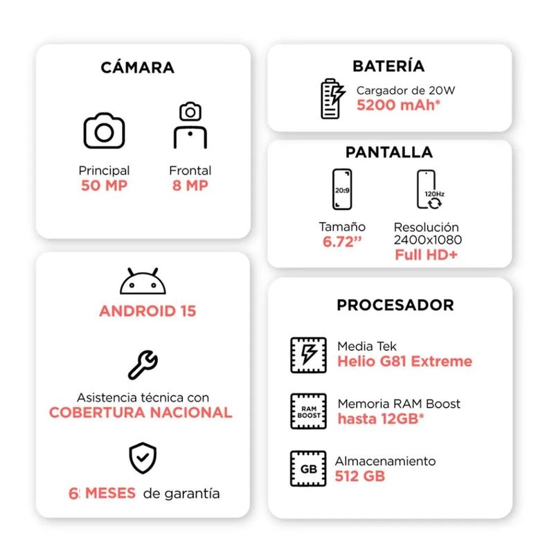 Equipado con un procesador MediaTek Helio G81 Extreme (12nm), con 8 núcleos (2x Cortex A75 a 2GHz + 6x Cortex A55 a 1.7GHz), este smartphone ofrece un rendimiento fluido, ideal para apps exigentes, navegación ágil y gaming casual.