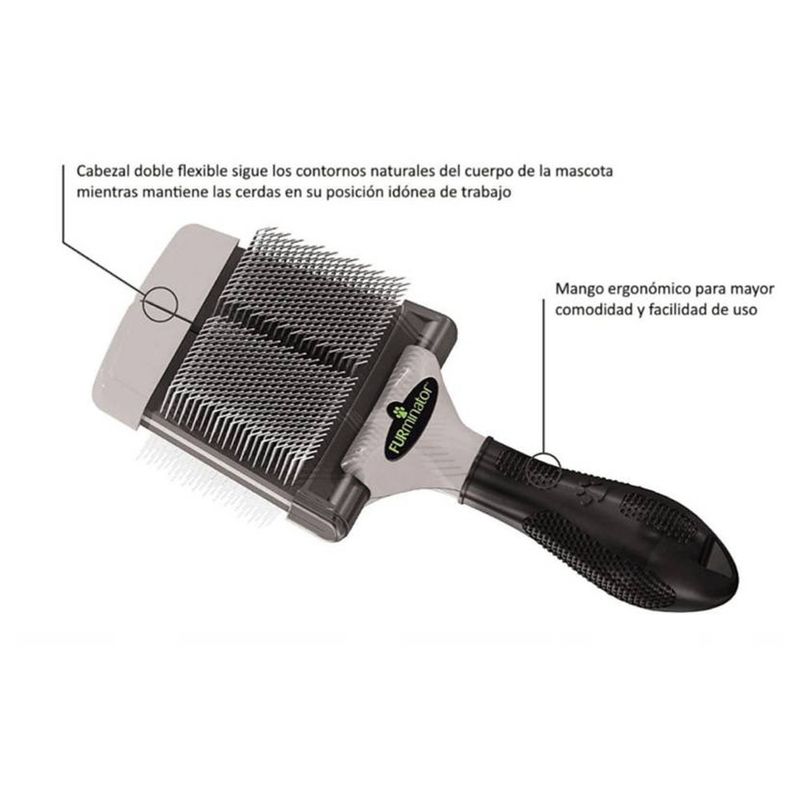 Furminator Firm Slicker Brush es una herramienta de calidad profesional que sirve para eliminar las marañas superficiales y desenredar el pelo de su mascota. Está especialmente diseñado para los perros y gatos con pelaje rizado, largo y de longitud mediana. El Cepillo Alisador, de dos caras y con cerdas de acero inoxidable, es suave con la piel y está disponible en dos variantes: las púas curvadas ayudan a eliminar los enredos más difíciles sin dañar el pelaje, mientras que las púas rectas consiguen un acabado bonito y brillante.