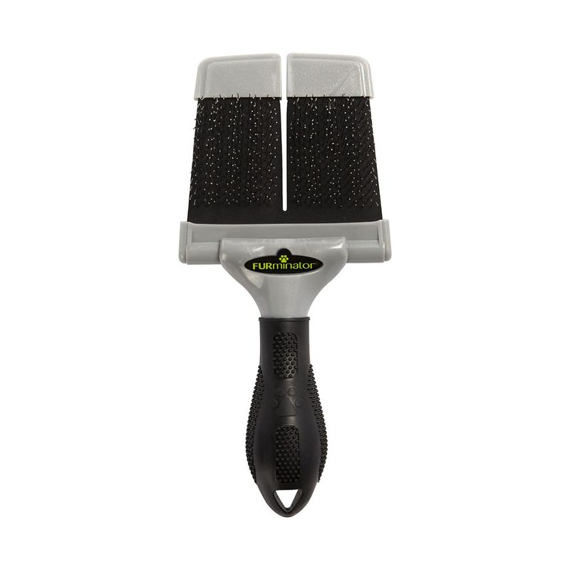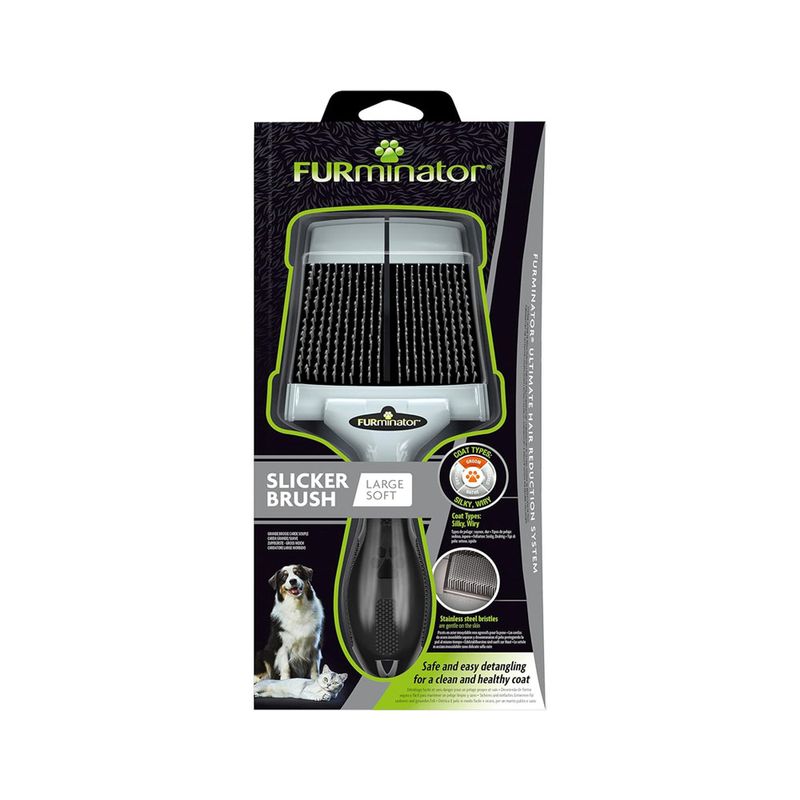 Furminator Soft Slicker Brush es una herramienta de calidad profesional que sirve para eliminar las marañas superficiales y desenredar el pelo de su mascota. Está especialmente diseñada para los perros y gatos con pelaje sedoso o duro. La carda con cerdas de acero inoxidable es suave con la piel y tiene el cabezal doble: una cara con las púas curvadas que ayudan a eliminar los enredos más difíciles sin dañar el pelaje; la otra con las púas rectas permite conseguir un acabado bonito y brillante.