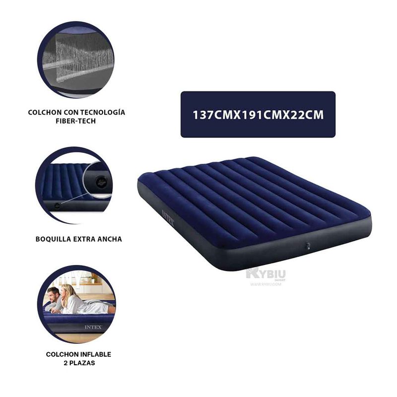 Adquiere nuestro colchón Inflable Placentero de 2 Plazas ,este colchón cuenta con una válvula de seguridad, ideal para descansar con mucha comodidad. Tiene de medidas 137 cm x 191 cm x 22 cm de material vinilo resistente, fácil de instalar de color azul. Además, cuenta con una superficie acolchada para hacer tus sueños realidad. Donde también lo puedes transportar con facilidad en tu sala o al lugar que quieras como al campo, a la playa, llevarlo en el viaje con la familia. Observaciones adicionales: las fotografías y descripción del producto son referenciales. Producto sujeto a stock. Garantía: 7 días por daños de fábrica.