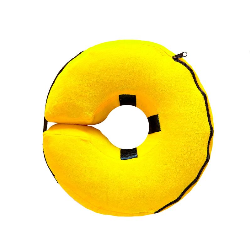 Collarín tipo donut modelo Party Amarillo, diseñado para brindar soporte y comodidad. Fabricado con materiales suaves y acolchados, incluye un ajuste con correa resistente para un uso seguro. Perfecto para viajes, descanso prolongado o recuperación.