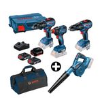 COMBO Bosch: 2 Taladros Percutor GSB 18v-50 + Llave de Impacto GDX18v-200 + Batería + Soplador aire GBL18V-120 + Maletín Porta herramientas