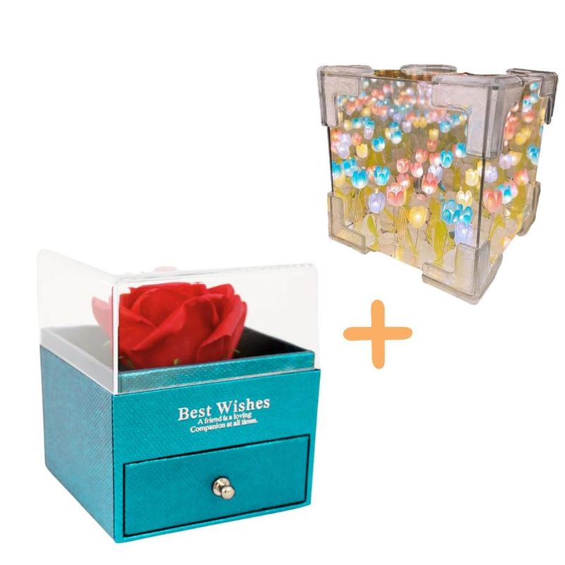 Acompañando esta joya, el cubo infinito con tulipanes ofrece una experiencia visual única gracias a su efecto espejo y su iluminación LED fija. Dentro, encontrarás tulipanes en tonos rosa y celeste, creando un contraste armonioso y delicado que aporta vida y calidez a cualquier espacio. El efecto infinito da profundidad y elegancia, haciendo de este cubo una pieza decorativa realmente especial.