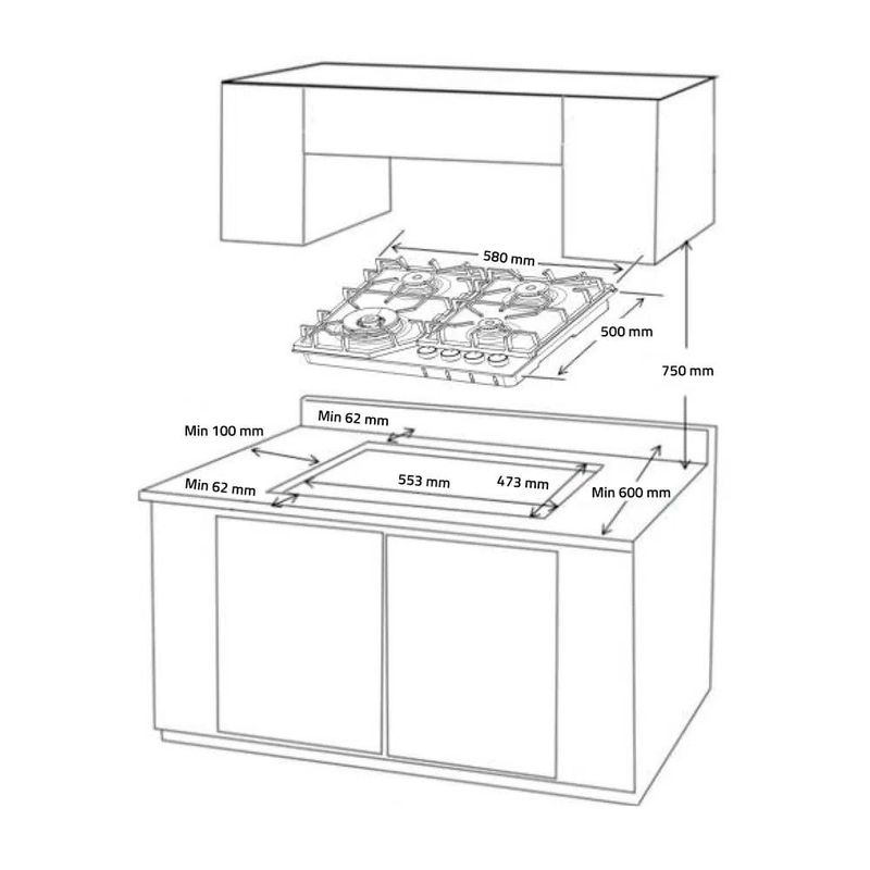 COMBO Encimera a gas empotrable Egasi-604cgne + Horno a gas HEI-75NGP + Campana extractora Cei-602ne Indurama