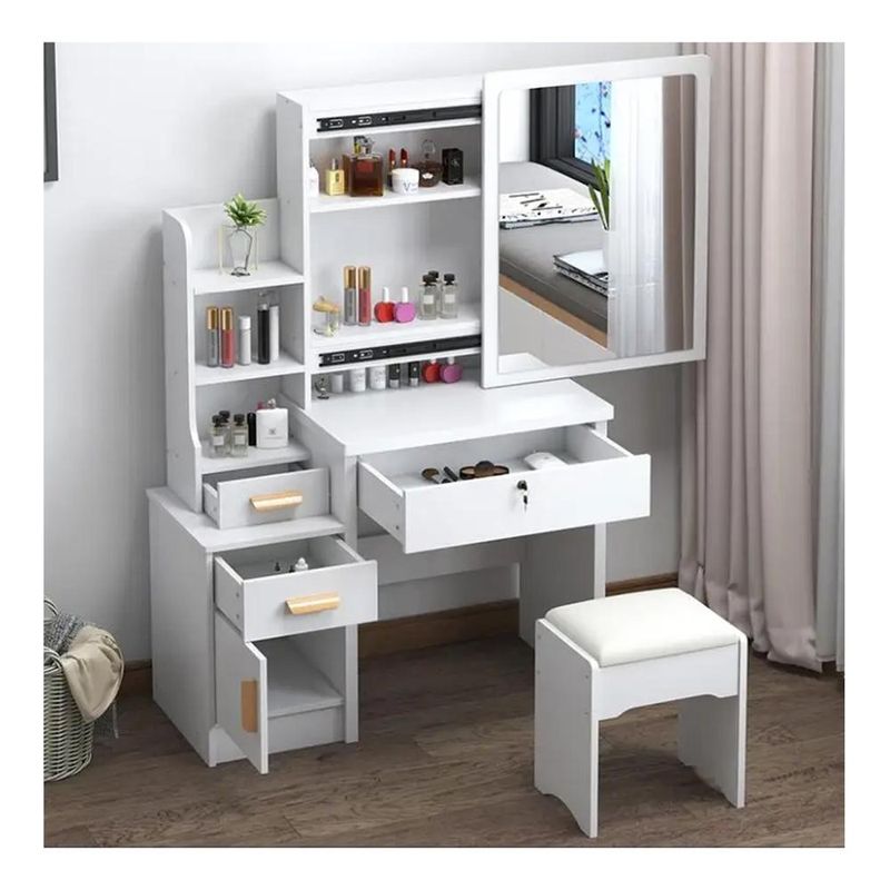 Lindo tocador de maquillaje para chicas, tiene en total 4 cajones, uno de ellos con llave. 5 divisiones para colocar y ordenar todas sus cosas, un espejo donde podrá verse y poder maquillarse con tranquilidad. Tiene también un lindo taburete muy suave para sentarse ya que tiene el asiento acolchonado. El espejo puede moverse de izquierda a derecha según lo que más le acomode.