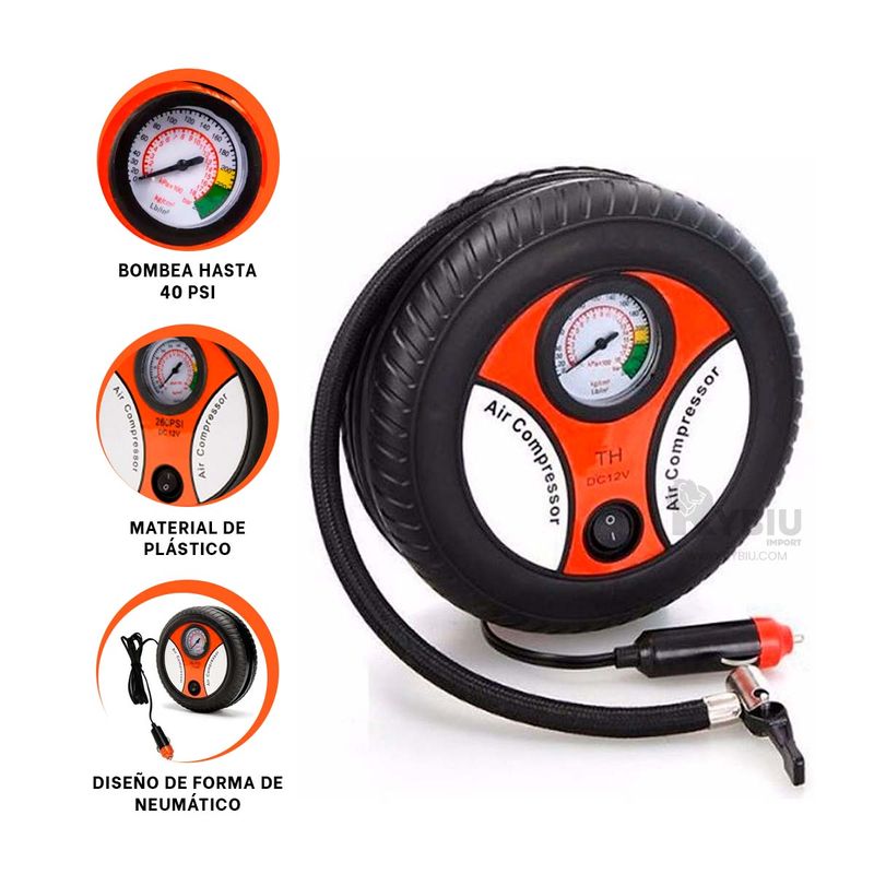 El compresor de aire portátil con forma de llanta, es una herramienta conveniente y compacta diseñada para inflar neumáticos y otros objetos inflables de manera rápida y eficiente. Es lo suficientemente pequeño como para caber fácilmente en la guantera de un automóvil o en una mochila, lo que lo convierte en un compañero de viaje ideal para emergencias en carretera o actividades al aire libre. Su diseño en forma de llanta lo hace fácil de reconocer y distinguir entre otros objetos en tu vehículo o equipo. El color negro le confiere un aspecto discreto y elegante, lo que lo hace adecuado para una variedad de entornos y situaciones. Observaciones adicionales: las fotografías y descripción del producto son referenciales. Producto sujeto a stock de colores. Garantía: 7 días por daños de fábrica. El Modelo de los(el) regalo(s) está sujeto a disponibilidad de stock y colores.