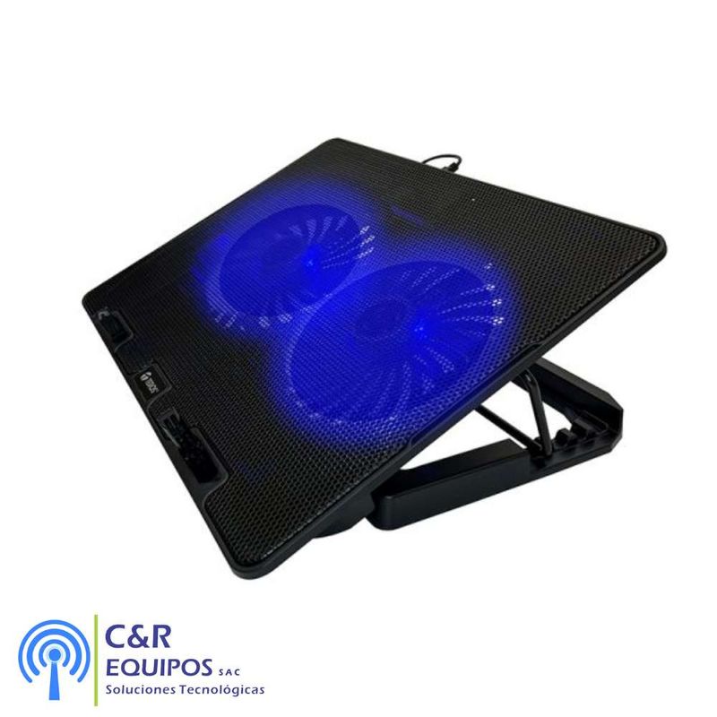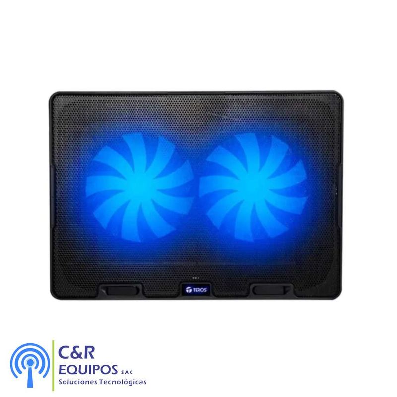 Cooler TEROS TE-7020N con velocidad de rotación ajustable de 1500 ± 10% RPM y luces azules. Equipado con dos ventiladores de 12.5 x 12.5 x 1.5 cm y ajuste de 5 alturas, con una inclinación máxima de 40°. Compatible con notebooks de hasta 15.6" e incluye cable USB.