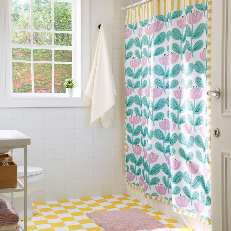 Cortina para baño de poliéster con tejido waffle y diseño estampado.