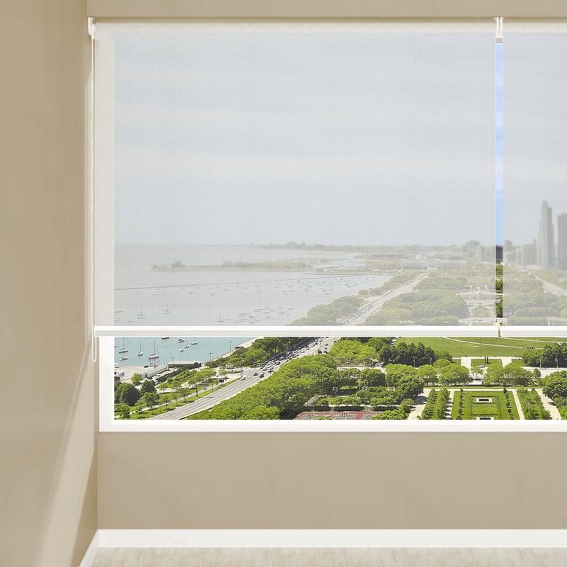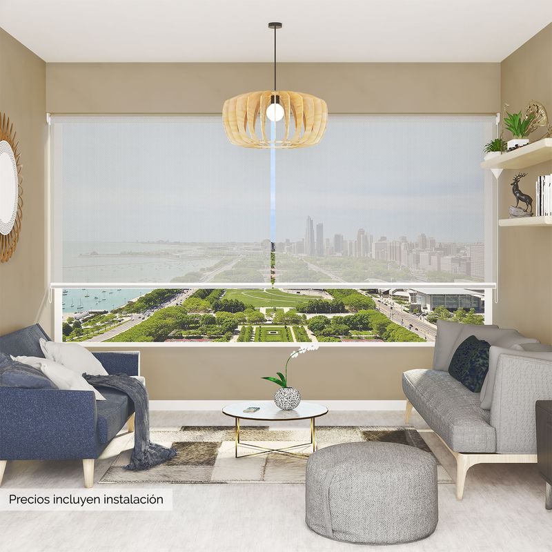 Cortina enrollable con tela traslucida, protección UV,factor de apertura de 5% de accionamiento manual. Foto Referencial.