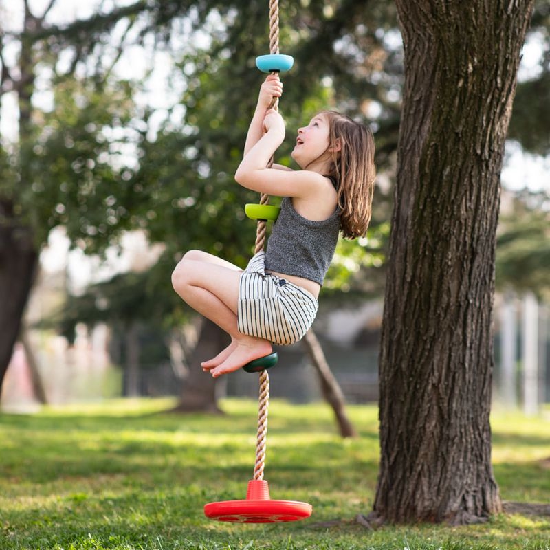 Cuerda columpio de escalada para el uso en exterior. Contiene sistema de anclaje con un gancho metálico.