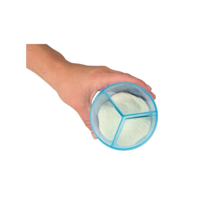 El dispensador de leche en polvo de Dr. Brown's, AZUL, está dividido en 3 partes para contener tres dosis de 250ml de leche en compartimentos separados. Puede retirar la parte interior para usarlo como recipiente o contenedor. Todas las piezas del dosificador se pueden esterilizar. Libre de BPA.