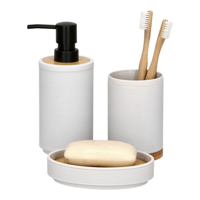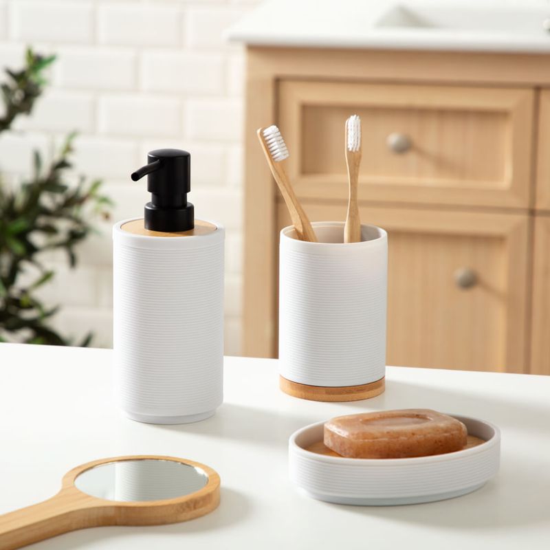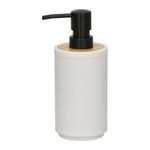 Dispensador de jabón de plástico y bambú. Ideal para combinar con la decoración de tu baño.