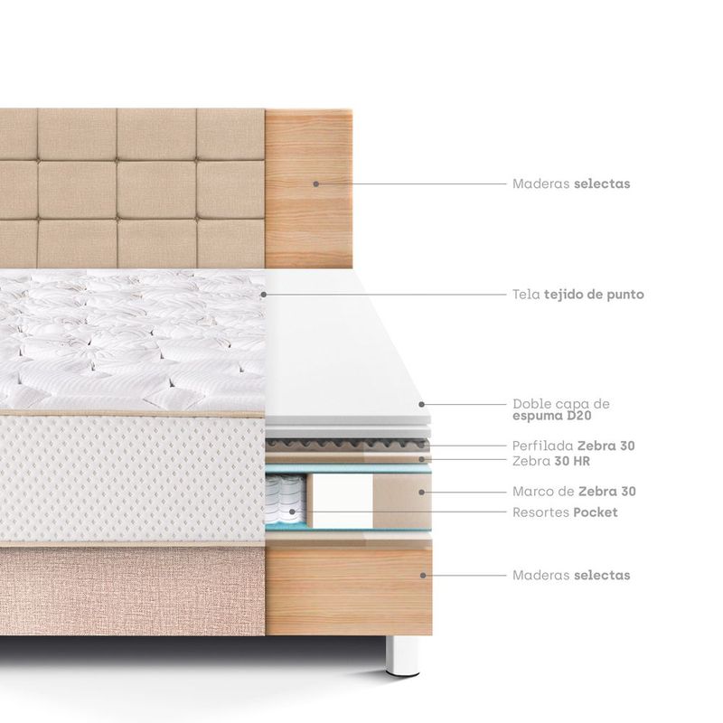 Royal Elizabeth está fabricado con espumas Zebra de alta resiliencia, materiales ecoamigables, resortes Pocket con independencia de movimiento y tela tejido de punto con hilos viscosa, lo que asegura un suave descanso para toda tu familia.