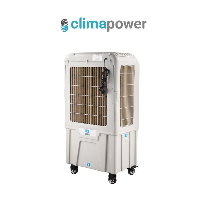 Enfriador de Aire Evaporativo CLIMAPOWER CPW50 El Enfriador de Aire Evaporativo CPW50 de Climapower es la solución perfecta para refrescar tus espacios de manera eficiente, económica y ecológica. Diseñado para ambientes de 35 a 45 m², este equipo combina potencia y bajo consumo energético, brindándote un ambiente más fresco y saludable. Con un caudal de aire de 7000 m³/h, 3 velocidades de ventilación y un depósito de agua de 80 litros, garantiza un enfriamiento constante durante horas. Su panel de control digital y control remoto facilitan el manejo, mientras que sus ruedas incorporadas permiten trasladarlo sin esfuerzo a cualquier lugar. Además, el CPW50 destaca por su fácil mantenimiento, funcionamiento sin instalación y su capacidad de mejorar la calidad del aire interior, reduciendo las emisiones de CO₂ y proporcionando un ambiente más limpio y confortable.