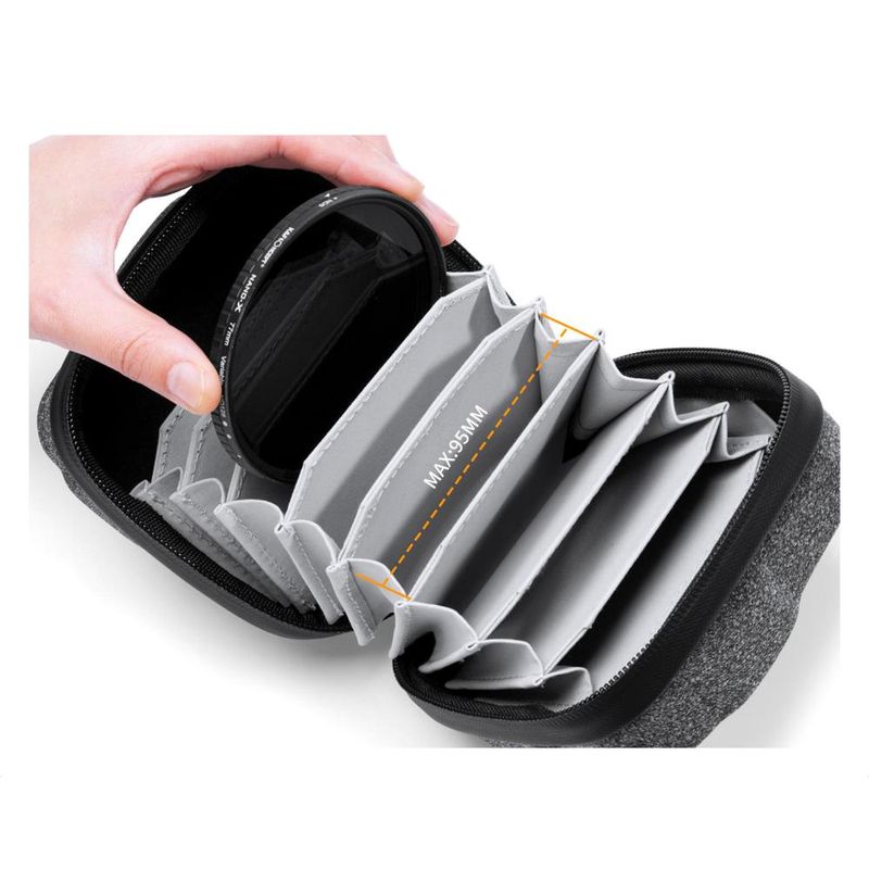 Esta bolsa para filtros de lentes cuenta con un amplio espacio de almacenamiento para hasta 10 ranuras, compatible con tamaños de filtro de hasta 95 mm.
