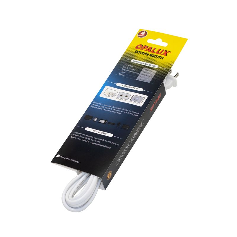 Extensión múltiple de 3 metros de cable vulcanizado, tiene 4 tomas Universales mas una toma extensible. Ideal para el hogar y resistente al medio ambiente.