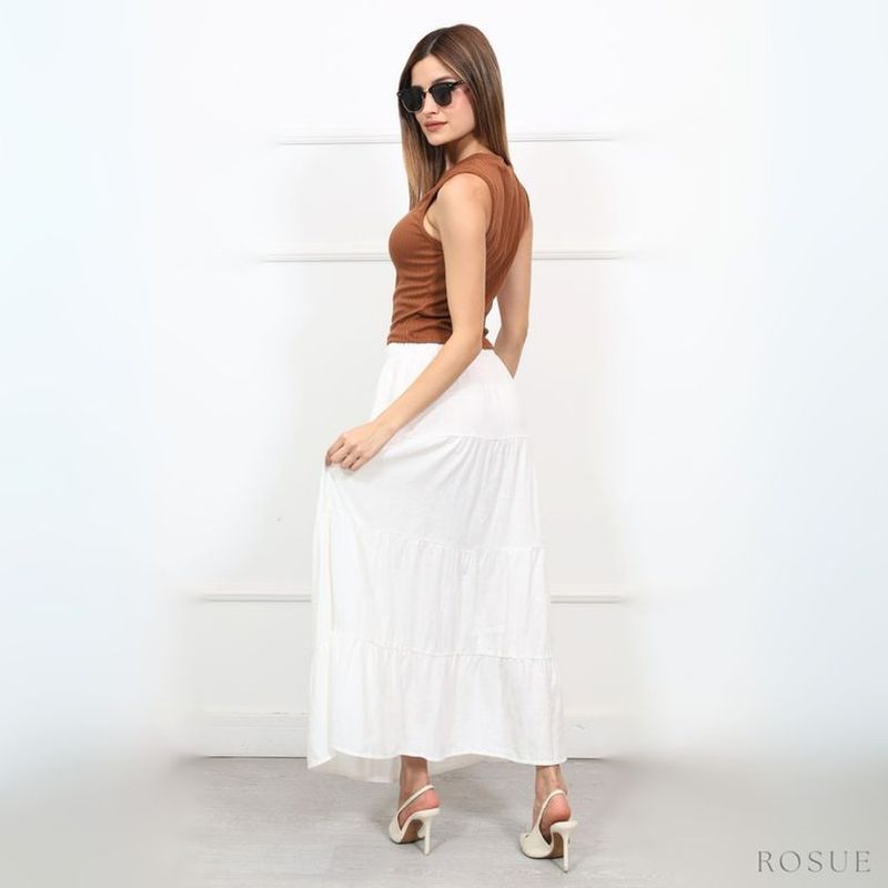 Falda larga para mujer confeccionada en tela de lino, color perla, con cintura elástica para un ajuste cómodo y adaptable. Su diseño fluido y elegante la convierte en una prenda versátil para looks casuales o formales, perfecta para cualquier ocasión.