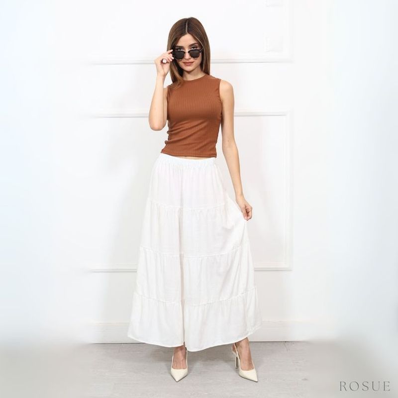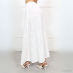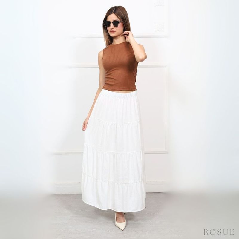Falda larga para mujer confeccionada en tela de lino, color perla, con cintura elástica para un ajuste cómodo y adaptable. Su diseño fluido y elegante la convierte en una prenda versátil para looks casuales o formales, perfecta para cualquier ocasión.