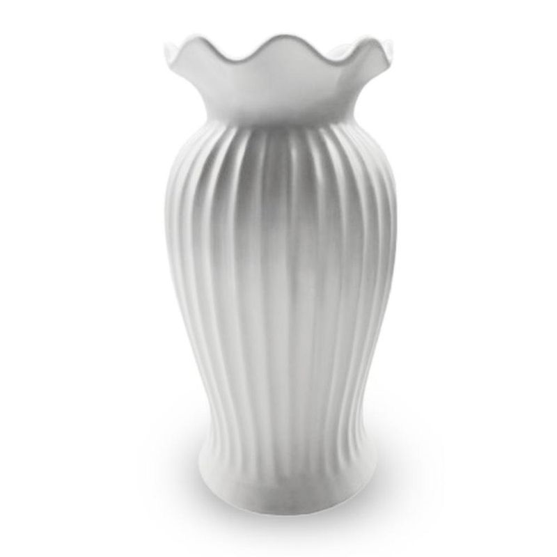 Florero decorativo estilo ánfora de color blanco, ideal para añadir un toque clásico y sofisticado a cualquier espacio. Tiene una altura de aproximadamente 19 cm, mide 8.5 cm de ancho en la boquilla y 9.7 cm en su parte más ancha. Su diseño elegante lo hace perfecto para arreglos florales medianos o como pieza decorativa por sí sola.