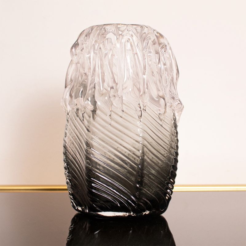 Florero Panadecor de Vidrio Transparente con Relieve Orgánico y Degradado Gris Ahumado 18CM