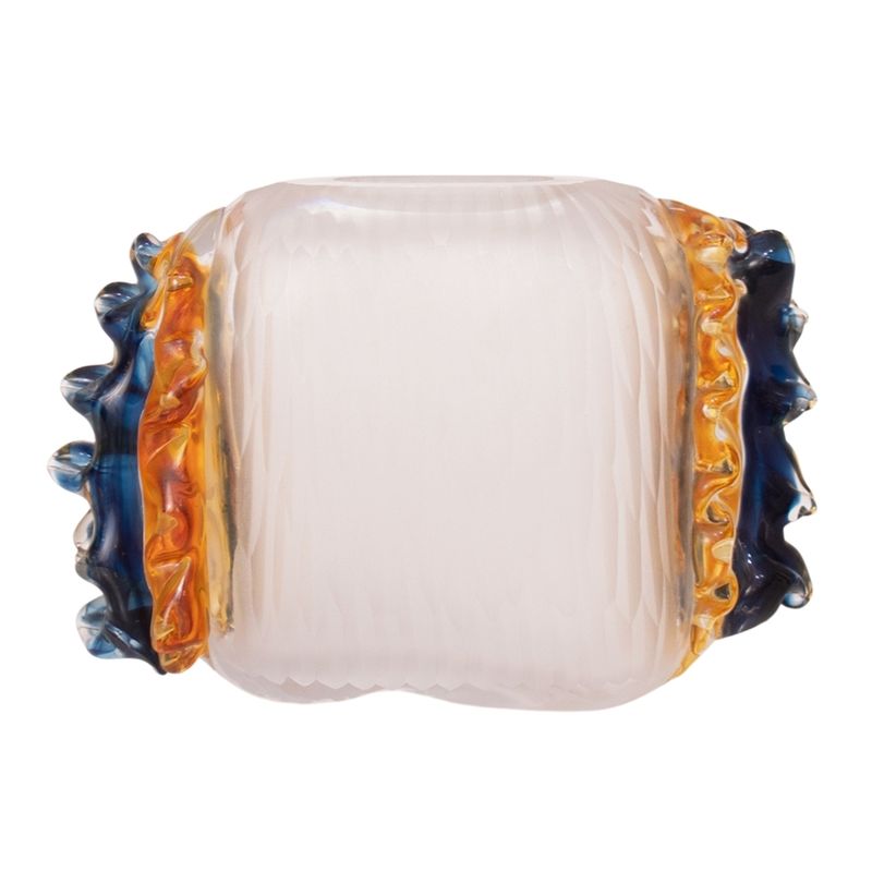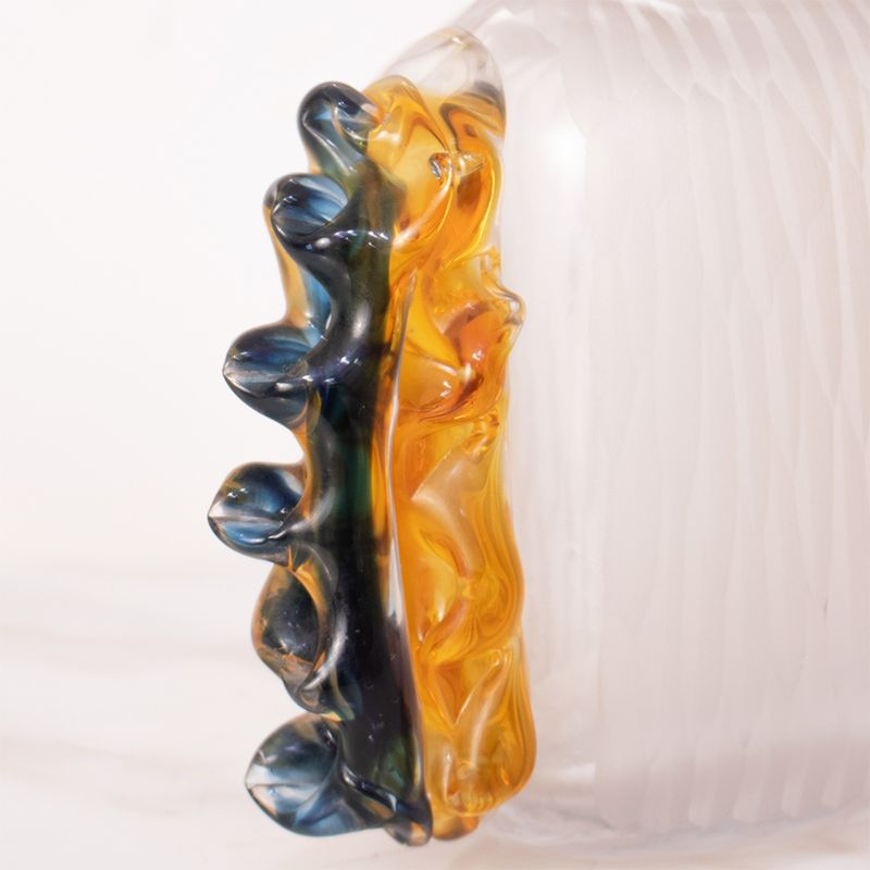 Este florero Panadecor combina elegancia contemporánea con una estética artística. Su cuerpo rectangular en vidrio transparente está decorado con relieves ondulados en tonos ámbar y azul profundo en los extremos laterales, generando un contraste vibrante y sofisticado. El acabado ligeramente esmerilado del cuerpo central le da una textura visual suave que complementa los detalles escultóricos de los bordes.