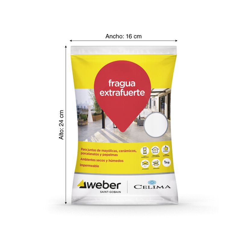 Fragua de baja absorción y mayor fluidez para juntas. Ideal para porcelanatos, baldosas de mármol y granito. Para piso y pared.