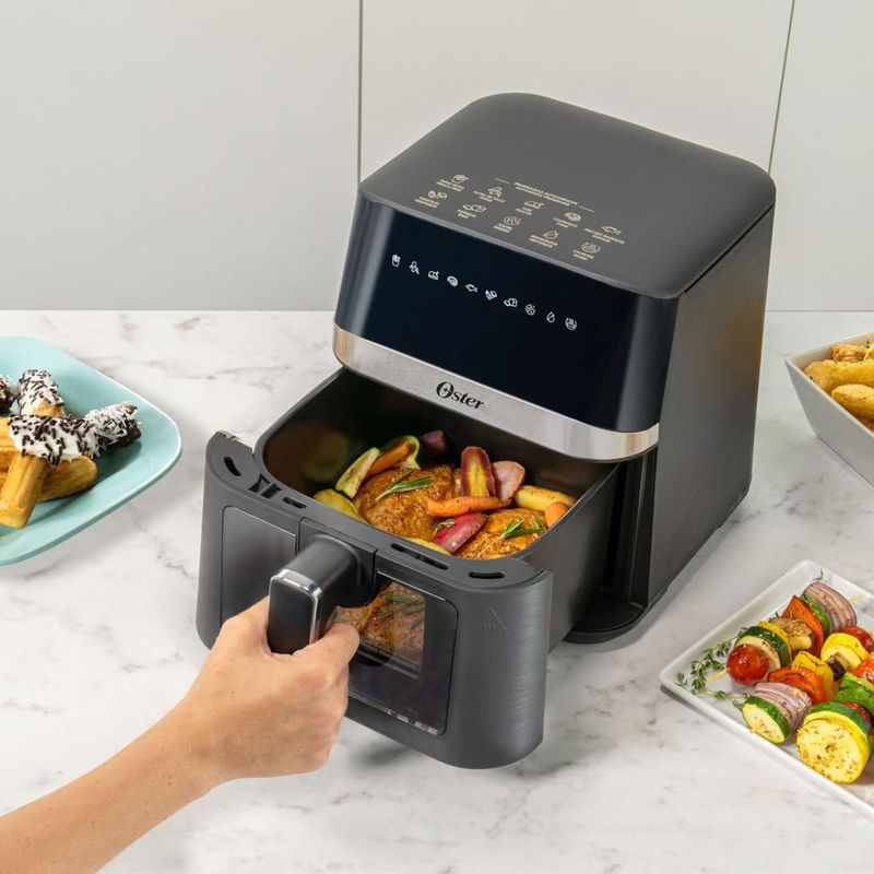 Transforma tu experiencia culinaria con nuestra freidora de aire digital Oster® de última generación. Con nuestro recubrimiento Oster® DiamondForce, que es hasta 12 veces más resistente a rayaduras y hasta 15 veces más fácil de limpiar* que los recubrimientos convencionales, tu freidora se mantendrá en perfectas condiciones durante más tiempo. Su capacidad de 4L** permite cocinar un pollo de hasta 2.3Kg. Equipada con una ventana transparente y una luz interna, esta freidora te brinda una visión clara del proceso de cocción en cada paso del proceso. Con 10 Programas automáticos: Papas fritas, alitas, aves, carne, vegetales, pescado/mariscos, hornear, postre, deshidratar y calentar. Esta freidora simplifica la preparación de una variedad de platos con solo tocar un botón. Además, nuestro innovador sistema de recordatorio automático te alerta para voltear la comida en medio del ciclo de cocción, garantizando resultados perfectamente dorados y crujientes en cada bocado. Ya sea que estés cocinando alitas, asando verduras o deshidratando frutas, esta freidora digital te ofrece versatilidad y conveniencia en cada uso.