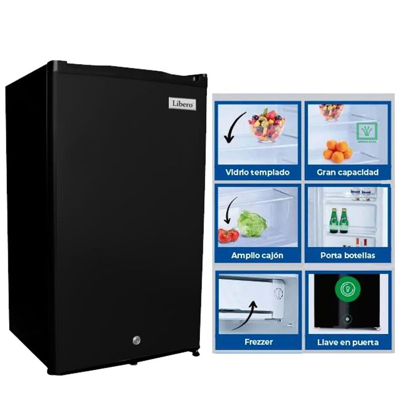 El frigobar LFB-101N Libero tiene un espacio especial para congelación en la parte superior (frezzer). Separadores fabricados de vidrio templado. Posee gran capacidad interior, su amplio cajón de plástico con asa permite una mejor organización de tus productos y cuenta con espacios especiales para organizar tus bebidas. Asimismo, su puerta con llave de seguridad te permitirá llevar un mejor control y administración de la mercadería. Tamaño ideal para espacios reducidos, practicidad para guardar bebidas y alimentos. Mejor conservación de alimentos.