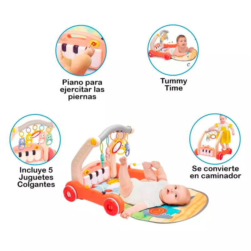 El aliado perfecto para el desarrollo y diversion de tu bebe. Este innovador gimnasio combina dos funciones en un solo producto: estacion de juegos con piano interactivo y caminador de apoyo para los primeros pasos, fomentando el aprendizaje y la estimulacion desde los primeros meses.