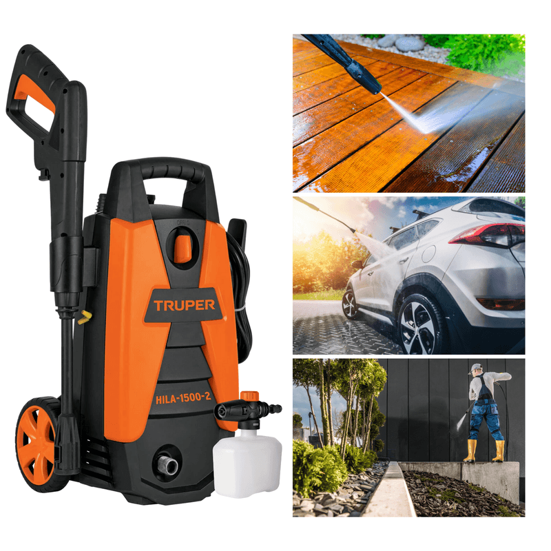 Accesorios incluidos: Lanza extension, lanza ajustable, lanza turbo, Pistola, Manguera alta presion 5m, Jabonera (550 ml), conector rapido para manguera, filtro de agua y limpiador de boquillas.