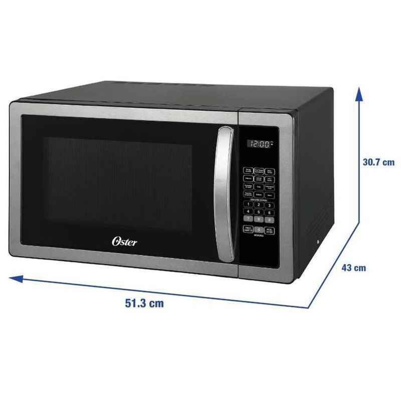Horno Microondas de la reconocida marca Oster con una capacidad de 30 litros permitiéndote preparar alimentos de gran tamaño, tiene un panel digital para su control y elegir entre sus 6 programas según la cocción especializada que desees, su potencia consta de 900 watts el cual optimiza la eficiencia del horno microondas en cada uso, su puerta manufacturada con acero inoxidable, la apertura frontal cuenta con una agarradera de acero inoxidable, en su interior tiene un plato giratorio de vidrio templado resistente a altas temperaturas, además posee un seguro para niños el cual brinda mayor seguridad, con su función grill gratina todos tus alimentos de manera uniforme.