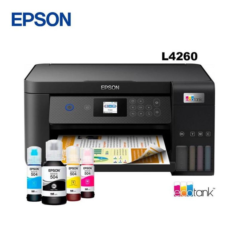 Contiene: Impresora EcoTank L4260 - Botellas de tinta de inicialización T504 - Cable de corriente AC - Cable USB - CD con drivers (Windows) - Documentación y garantía.