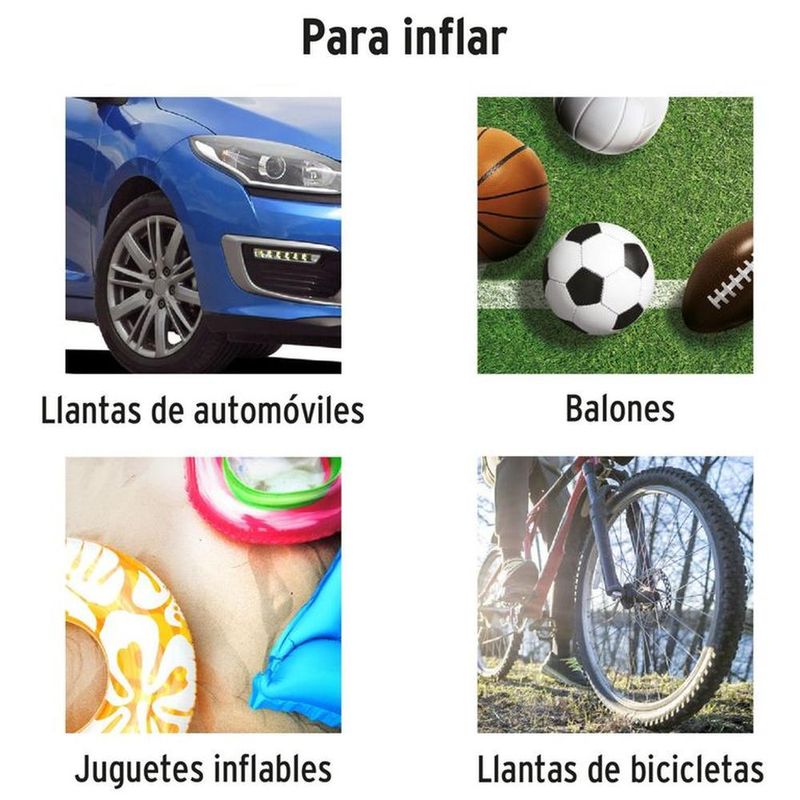 • Ideal para inflar balones, juguetes inflables, llantas de bicicletas y neumáticos