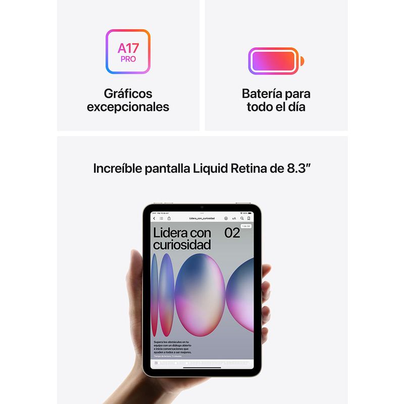 El nuevo iPad Mini de séptima generación en color Blue combina potencia y portabilidad en un diseño elegante y ligero. Su pantalla Liquid Retina de 8.3” ofrece colores vibrantes y una excelente resolución, ideal para ver contenido, navegar en la web o trabajar desde cualquier lugar. Además, su construcción en aluminio lo hace resistente y sofisticado, manteniendo la esencia premium de Apple en un formato ultracompacto.