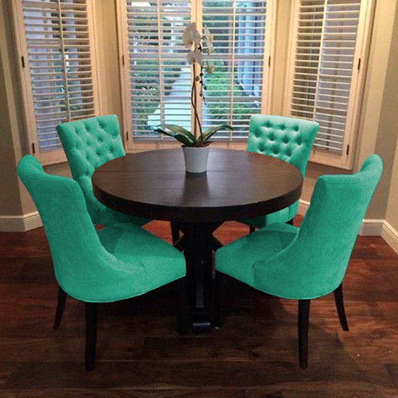 -Silla color: Nogal, Tapiz: Iker color turquesa, relleno: Espuma paraíso, resorte y algodón y estructura: Madera tornillo.